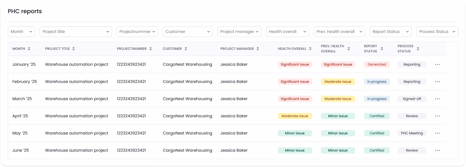 Project Health Check is geschikt voor organisaties die meerdere projecten tegelijkertijd hebben lopen én de projecten langer lopen dan 3 maanden. PHC schaalt mee met organisaties. Van enkele projecten tot grote portfolio’s: kleinere organisaties krijgen scherp inzicht per project, grotere organisaties krijgen betrouwbaar overzicht via managementdashboards. Zonder extra rapportagedruk.